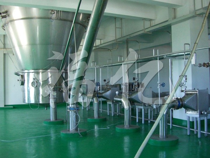 該生產(chǎn)線由供料系統(tǒng)、介質(zhì)循環(huán)系統(tǒng)、空氣加熱凈化系統(tǒng)、干燥塔系統(tǒng)、收料系統(tǒng)、控制系統(tǒng)等多個(gè)系統(tǒng)整合而成。主塔系統(tǒng)集中了目前噴霧干燥工程的所有^技術(shù),噴干機(jī)組的收料系統(tǒng)由一級(jí)旋風(fēng)分離器+布袋除塵器組合形成。一級(jí)旋風(fēng)采用高氣量高效率旋風(fēng)進(jìn)行收集,其收粉率能達(dá)到96%左右分,而布袋除塵器是針對(duì)蛋白粉類除塵專門設(shè)計(jì)的優(yōu)化設(shè)備,能使物料與風(fēng)進(jìn)行完全分離并沉降,布袋為拒水防油防靜電布袋,過濾目數(shù)可達(dá)500目以上。